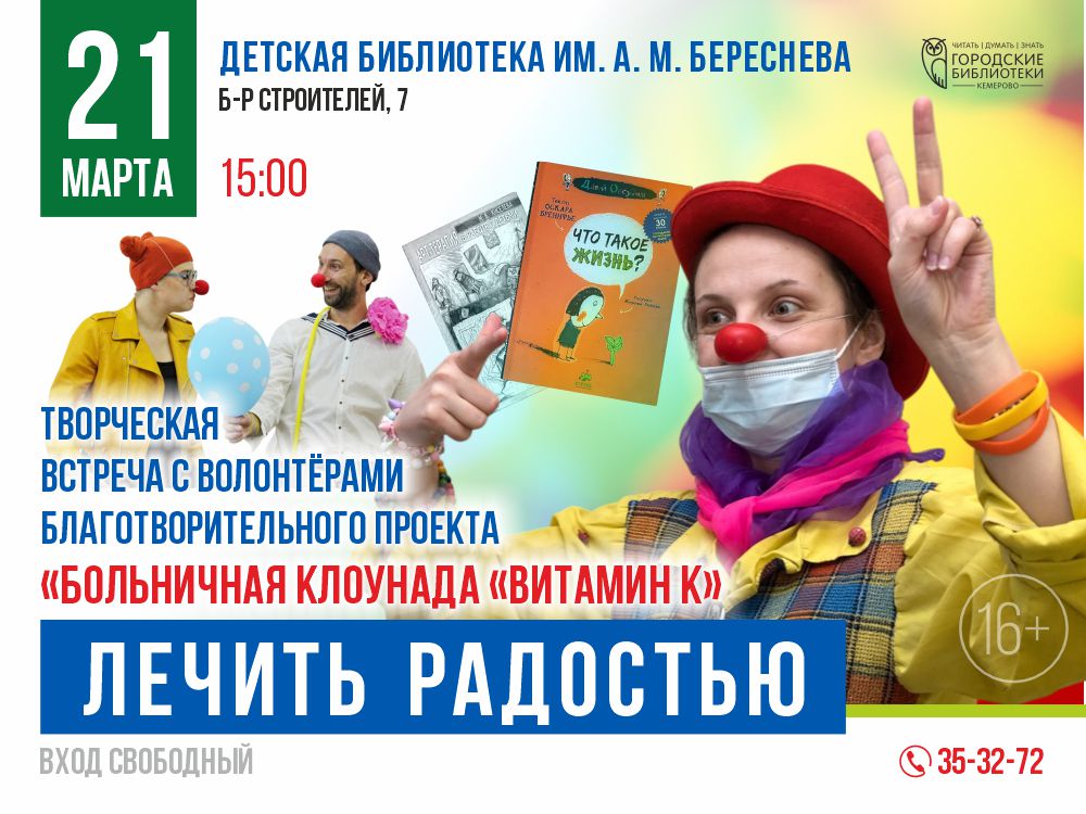 21 марта в 15:00 в Детской библиотеке им. А. М. Береснева (б-р Строителей, 7) состоится творческая встреча «Лечить радостью». Гостями мероприятия станут волонтеры благотворительного проекта «Больничная клоунада «Витамин К», которые уже 15 лет помогают детям в больницах Кузбасса справляться с болезнью через смех и игру. Больничная клоунада – это международное движение «веселых помощников врачей», активно развивающееся в Москве, Казани и других крупнейших городах России. Кузбасский проект был основан артистом оригинального жанра и педагогом Виталием Выдригановым. Идею поддержали студенты, создав некоммерческое объединение, которое сегодня известно, как «Витамин К». Встреча организована специально для участников клубного объединения «Чтение без границ» и всех желающих познакомиться с темой социального волонтерства. В программе мероприятия: - Просмотр и обсуждение документального фильма «Доктор для жизни». - Диалог с волонтерами о реальном опыте работы в больничных палатах. - Обсуждение специфики профессии: чего в ней больше – искусства, педагогики или психологии. - Ответы на вопросы читателей. Мы надеемся, что живое общение с волонтерами поможет лучше понять ценность помощи ближнему и, возможно, подтолкнет их к решению самим стать частью волонтерского движения. Телефон для справок: 35-74-15. Возрастное ограничение: 16+. Вход свободный. |