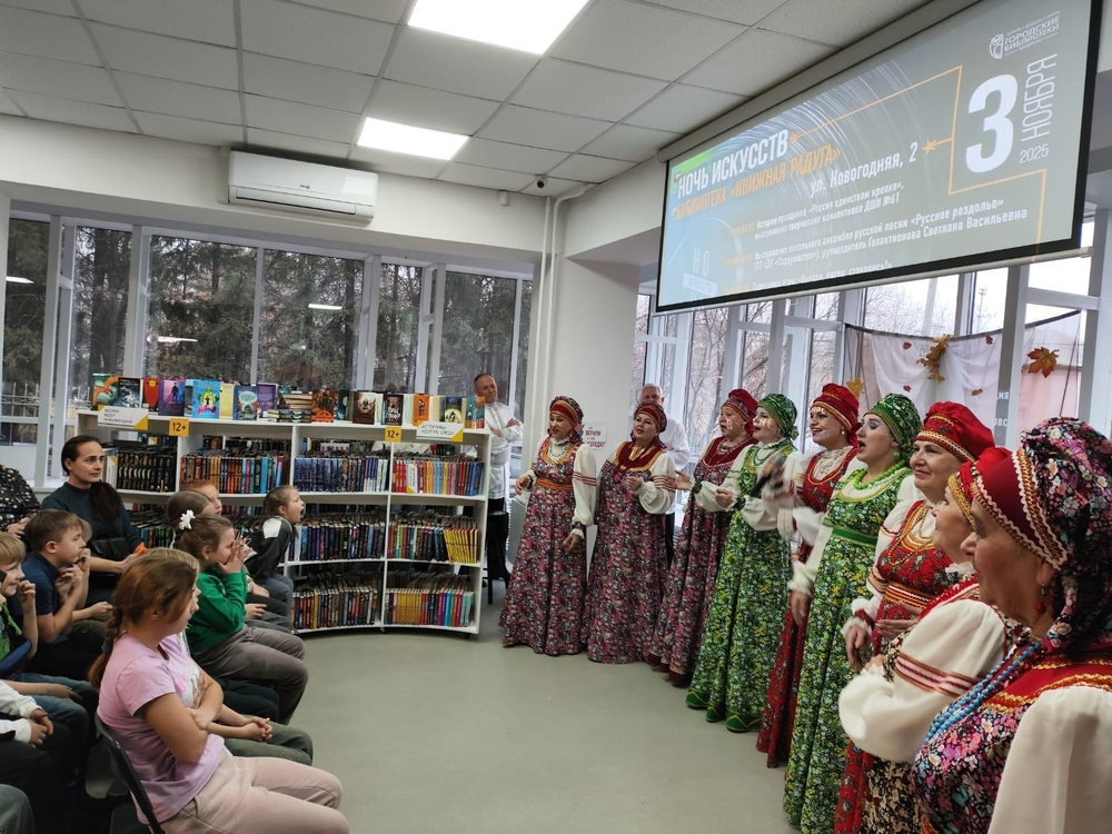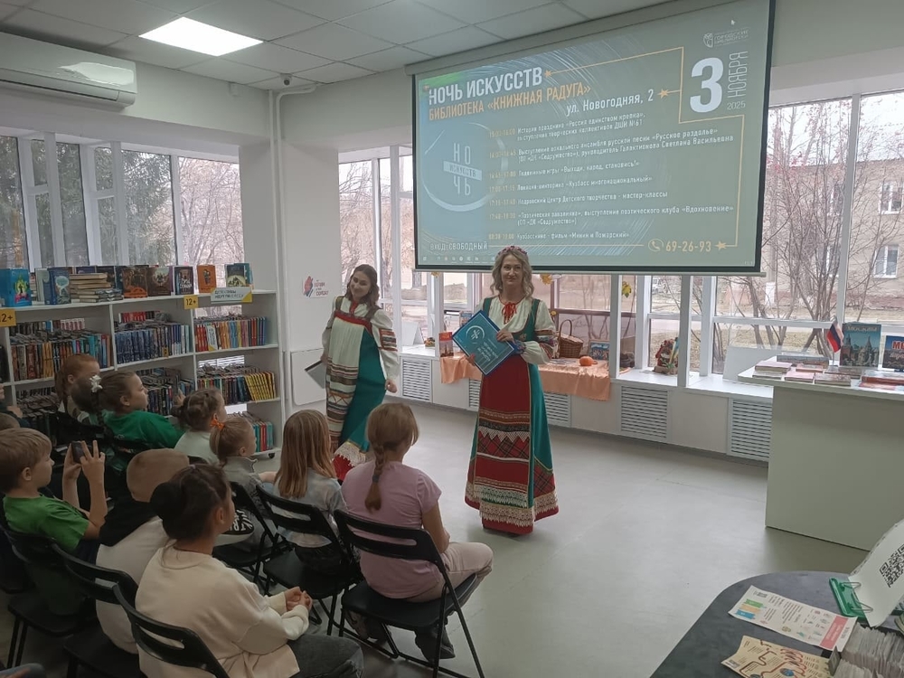 3 ноября Муниципальная информационно-библиотечная система г. Кемерово присоединилась к ежегодной Всероссийской акции «Ночь искусств». Мероприятие, прошедшее под общим лозунгом «В единстве культур – сила народа», объединило три городские библиотеки, предложив многочисленным гостям насыщенные программы, посвященные многообразию традиций и творчества народов России. Этот вечер стал ярким праздником дружбы, познания и культурного обмена, собравшим сотни кемеровчан и гостей города. Библиотека городских историй распахнула свои двери для семейной аудитории, где каждый нашел занятие по душе. Здесь с азартом прошел увлекательный семейный квиз «ПРО ТАДИЦИИ», позволивший в игровой форме узнать больше о народных обычаях. Самые маленькие посетители с удовольствием смотрели добрые мультфильмы, а все желающие могли проявить свои творческие способности на разнообразных мастер-классах. Приятным завершением для многих стала акция «Книга в подарок», пополнившая домашние библиотеки новыми изданиями. В модельной библиотеке «Книжная радуга» программа была особенно насыщенной и динамичной. Вечер открылся с исторического экскурса «Россия единством крепка», после чего на сцене выступили талантливые коллективы ДШИ №61 и проникновенный вокальный ансамбль русской песни «Русское раздолье» под руководством Светланы Васильевны Галактионовой из ОП «ДК «Содружество», завороживший слушателей народными мелодиями. Активные гости с радостью присоединились к подвижным играм «Выходи, народ, становись!», а затем проверили свои знания в викторине «Кузбасс многонациональный». Увлекательные мастер-классы от Кедровского Центра Детского творчества дали возможность попробовать себя в прикладном искусстве. «Поэтическая завалинка» с выступлениями поэтического клуба «Вдохновение» (ОП «ДК «Содружество») подарила моменты лирического вдохновения, а завершился вечер просмотром исторического фильма «Минин и Пожарский» от Кузбасскино, погрузившим зрителей в героическое прошлое страны. Модельная библиотека «Родник» предложила гостям погружение в мир уникальных историй и культурных открытий в формате праздничной программы. Вечер открылся с интригующей презентации коллекции «Неваляшки» художницы Натальи Шепелевой, которая поделилась секретами создания и психологическим значением этой известной игрушки. Представители комнаты татарского быта «Ак калфак» увлекли слушателей мудрыми татарскими сказками, а главный библиотекарь Вера Юрьевна Тюмерова представила увлекательный поэтический гид по Чувашии, рассказав трогательную историю чувашских Ромео и Джульетты – Нарспи и Сетнера. Руководитель театра сибирского фольклора «Русичи» Ольга Ивановна Оленева зажгла зал «Осенними хороводами и играми», создав атмосферу истинного народного гуляния. Концертную программу продолжили талантливые воспитанники школы искусств №69, порадовавшие зрителей своими выступлениями. На протяжении всего вечера в разных локациях «Родника» гостей ждали многочисленные творческие мастер-классы: они смогли моделировать забавные фигурки из воздушных шаров в технике твистинг, создавать оригинальные книжные закладки и красочные 3D-открытки. Под чутким руководством мастера Вадима Викторовича Карманова каждый желающий попробовал свои силы в искусстве рисования 