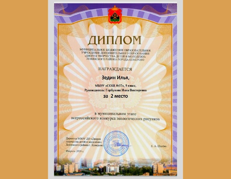 Пятиклассник Илья Зедин из МБОУ «Средняя общеобразовательная школа № 37», постоянный читатель Арт-библиотеки (ул. Космическая, 25), продемонстрировал выдающиеся результаты на муниципальном этапе Всероссийского конкурса экологических рисунков, заняв почетное второе место. Конкурс, проходивший с 17 ноября по 1 февраля текущего года на базе МБОУ ДО «Дворец творчества детей и молодежи» Ленинского района города Кемерово, ставил целью привлечение детской аудитории к вопросам охраны природы и развитие экологической культуры.